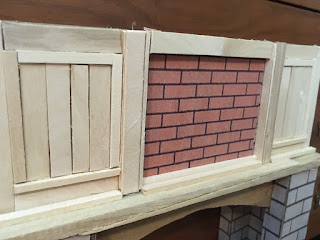 The hearth model itself is made from chipboard with paper printed as brick glued on and basswood & popsicle stick details. The matching settles are basswood and the stand-in hanging hams & braided garlic is tissue & string.