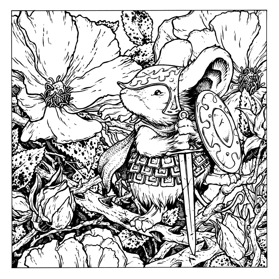Since 2012 I've released a new 11" x 11" limited edition print every year. Past year's pieces have been titled "Peacock", "Raspberry","Moonflower", "Lavender", and "Juniper". Julia requested that these prints be pretty and not just a mouse doing battle, but more aesthetically feminine. To the left is the finished artwork for this year's "Rose" and below I'll show the full process.The print is available in my online store and at my convention appearances until the print sells out