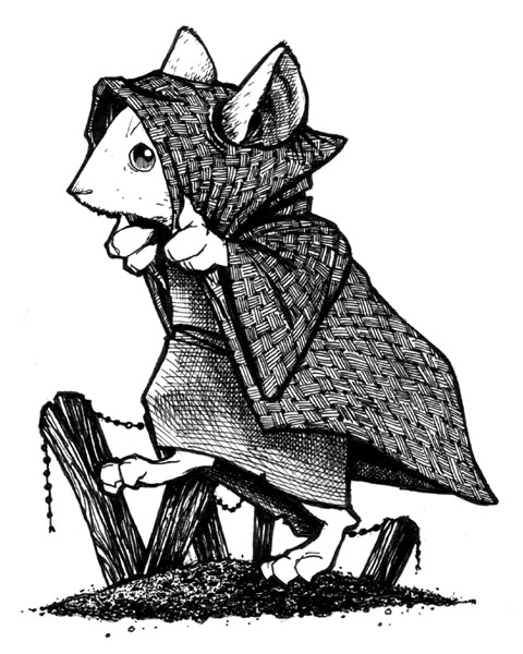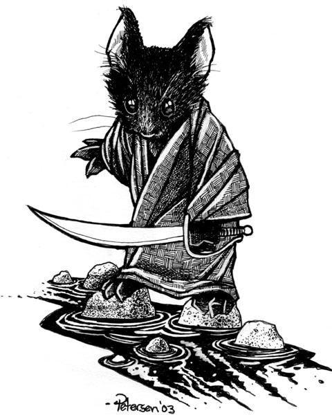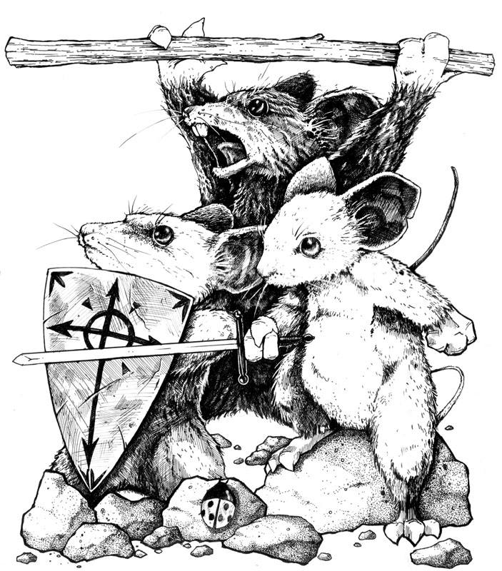 In 2003 I was at a family bbq, and drawing the mice. I did the drawings in ink & fell onto my etching techniques to make grey tones and interesting patterns. Instead of mimicking my favorite artists and illustrators, I was drawing like myself, and building on work & techniques of my own to push the drawing out somewhere new.These drawings were also part of the very very first Mouse Guard sketchbook that pre-dated my self-published black and white issue of Mouse Guard in 2005. The first time I set up at the Motor City Comic Con was in October of 2004. I was going to be an artist at an artist alley table, with no book and no previous working experience. All I had were pieces of artwork I made as a fan, for fun, and my own concepts and ideas. Using my home printer, I printed out samples of pieces I'd done. Everything from watercolors of superheroes to pencil drawings of fantasy characters, and of course, some Mouse Guard images.
