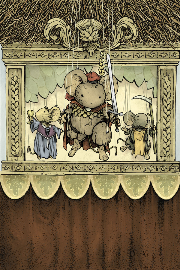 To prepare for drawing this story, I built a few props as guides for me. I printed out the stage proscenium from my cover art for the book (done in advance of the story) and cut it up adding a few basswood sticks and cardboard to create a paper-stage model. I made a few backdrops and flying walls to scale for the stage so that each scene would be playing out in new locations while still seeming like a believable stage play. I also sculpted a mouse marionette that I could pose for reference to get the joints and weight of the lifless limbs correct..