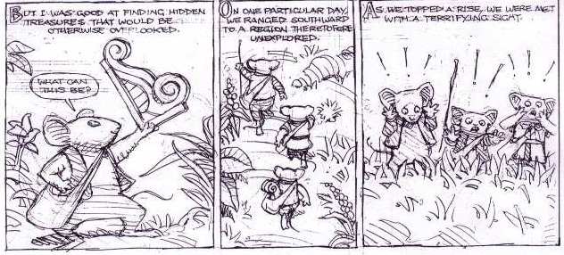 Charles: I think I remember imagining them as pirates, or plunderers, and they would wear outfits made up of leaves and sticks and whatever else was lying around. And that some of their outfits were made up of animals they've killed, but more telling would be what animals. One of them wears a small turtle shell, which would suggest this mouse killed a young, slow moving animal, and the leader has a bunch of baby bird skulls tied to his back. So essentially they're bullies who pick on weaker animals, or kill them and take what they want. Their insignia is a baby bird skull, probably due to some backstory with the leader. Maybe he couldn't kill a full grown bird so he went after its children, or maybe those mice developed a taste for bird flesh and somehow they thought the bird skull insignia would best represent what they are, or maybe it's a joke. David: On my blog, I talk a lot about process and materials, and my fans are always really interested to know about that stuff too. Walk us through the process from rough to watercolored page for this story. And tell us the materials used.