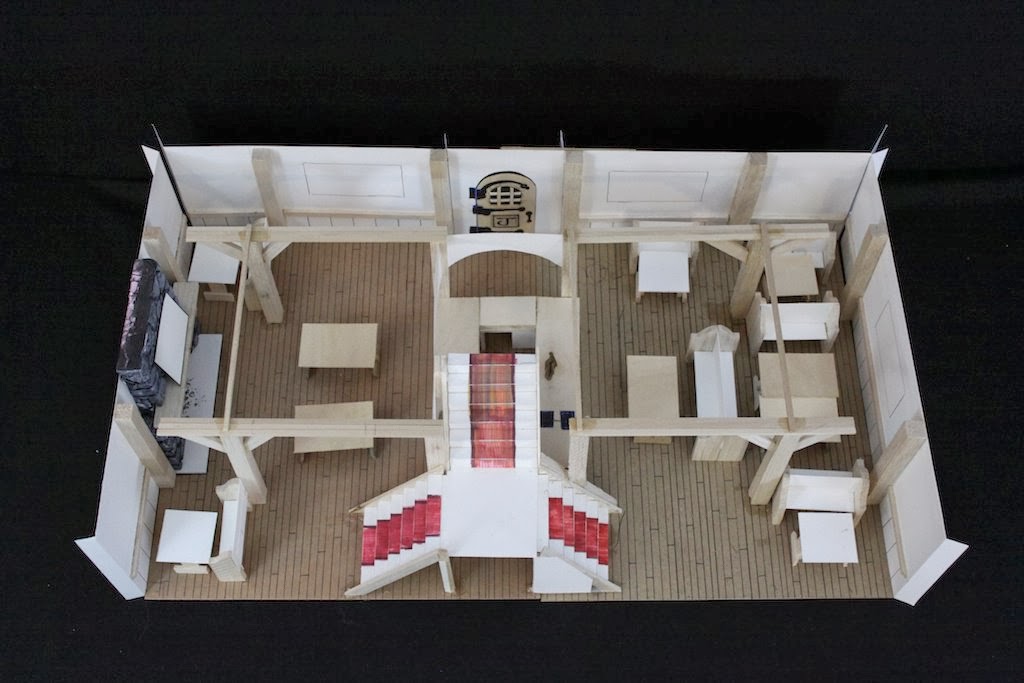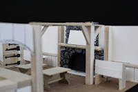 I find making models like this to be very helpful not just with helping drawing in perspective, but also to help design a room in three dimensions as you build it. I decided to center the ceiling peak as I built this model, not just because it was easier, but because I as I held the rafters in different positions, I preferred it being not directly above the little platform the mice are on.