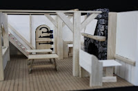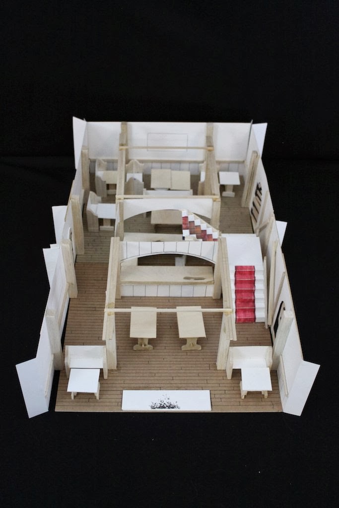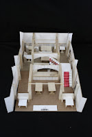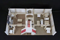 Using a few dishes & coffee mugs as circle templates, scrap bristol, cardboard, chipboard and basswood, I made model of how I thought the room should look. the brackets were cut on a small jigsaw to make life easier.