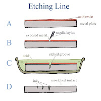 Line: (A): Etching is done by taking a metal plate (I used zinc) and coating it with an acid resist (these can vary depending on the desired effect, but that's not important for this overview). (B): Then the resist is lightly scraped away with a stylus or needle when an image is drawn on the surface of the plate so that the metal is exposed in the areas where the lines will be.