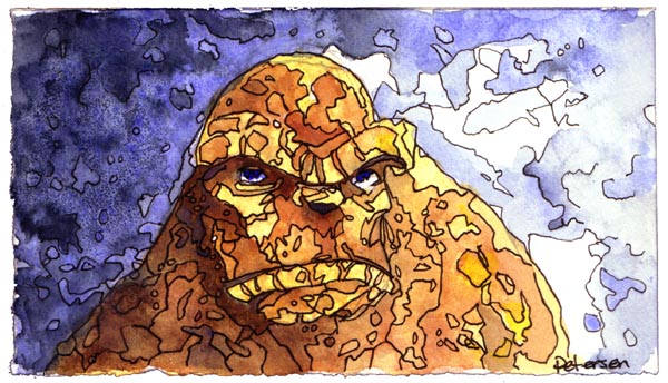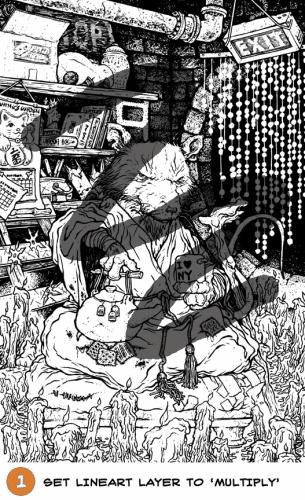 The inks were done by printing out the digital composite of all my sketches and taping that printout to the back of a sheet of Strathmore Bristol. On a lighbox I'm able to see through the bristol surface to the printout and use that as a guide for inking. This means I don't have to erase pencil on the final image (though I did make a few tightened corrections in pencil before inking the whole piece). I used Copic Multiliners (the 0.7 and 0.35 nibs and a brush tip for the trees). It was tricky to make sure I wasn't adding details to the armor that wouldn't show up when the final piece was reduced for printing. In the inked version, the trees come out much stronger than my vision of the final art, but I needed a solid inked shape to manipulate in color, so it unbalances the inked piece a bit.
